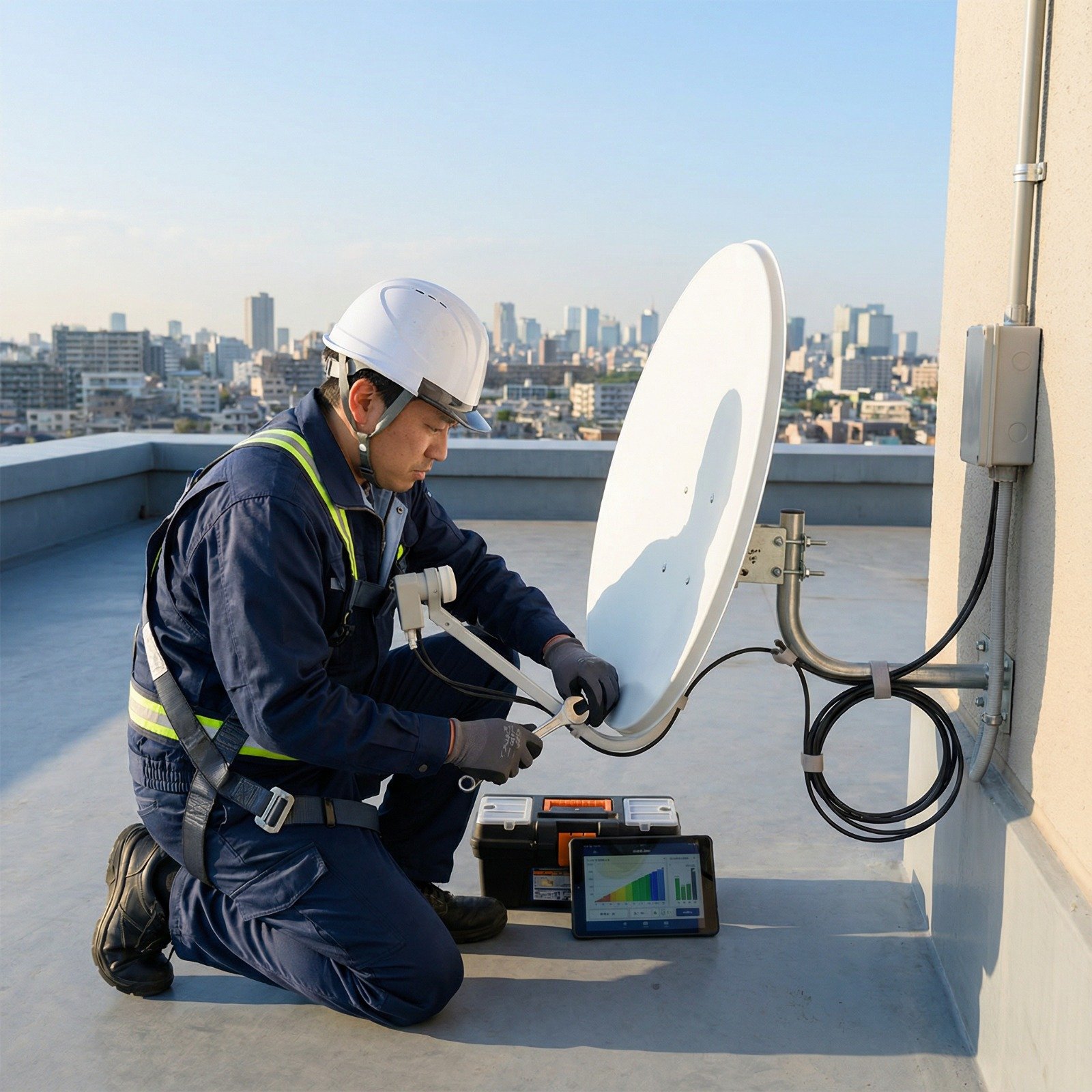 تركيب احترافي آمن: نتبع معايير السلامة خلال عملية التركيب، حيث يستخدم الفني معدّات تسلق آمنة عند العمل على الأسطح المرتفعة ويتخذ كافة إجراءات الحماية. نضمن تثبيتًا قويًا للطبق وهيكل الدش بحيث يصمد أمام الرياح والعوامل الجوية. بالإضافة إلى ذلك، نحرص على تأريض نظام الدش (ربط الطبق بالأرضي الكهربائي) إن لزم الأمر لحماية المعدات والافراد من تفريغ الشحنات الكهربائية خاصة أثناء العواصف الرعدية.